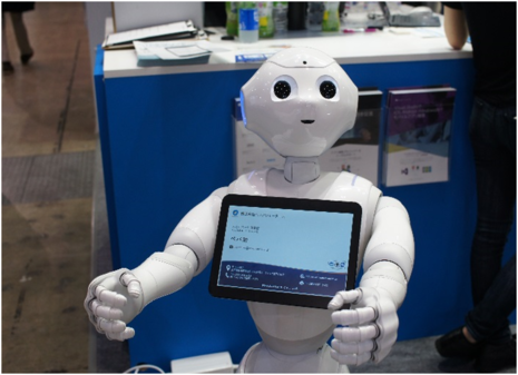 胸元のタブレットで特製のPepper名刺の表示を行います。